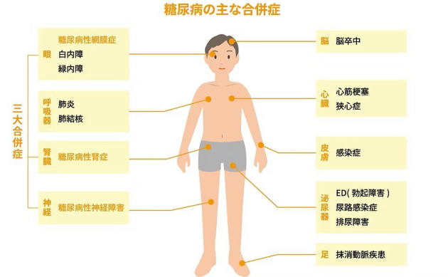 この状態が長期間続くと、全身の血管が傷つけられ、失明・腎不全・心筋梗塞・脳卒中・閉塞性動脈硬化症など様々な合併症を引き起こします。日本では1,000万人ほどが糖尿病に罹患しているといわれています。